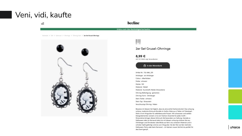 Auch wenn sich dieses Produkt besonders für die Karnevals- und Halloweenzeit eignet, um ein Kostüm zu ergänzen, kann es auch das gesamte Jahr über getragen werden. In unserem Beispiel verkaufen wir die Ohrhänger daher das gesamte Jahr über, sie sind also immer im Sortiment. Außerhalb der Kostüm-Saison sollte der Text anders lauten, da auch die Suchbegriffe andere sind.