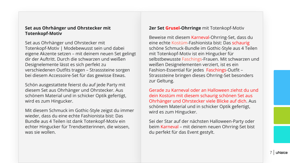 Wenn du nicht nur den Titel, sondern auch den restlichen Text auf den jeweiligen Anlass anpasst, steigt für Google die Relevanz dieser Ohrhänger weiter an. Deine Produkte steigen im Ranking und werden besser von deiner Zielgruppe gefunden.