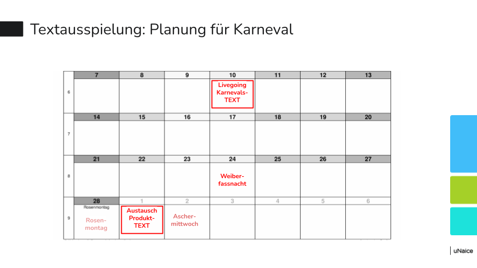 Wann fangen deine Kund:innen an, nach einem passenden Halloween- oder Karnevalskostüm zu suchen? Die Texte sollten rechtzeitig auf deiner Seite ausgespielt werden, um nicht nur Last-Minute-Entscheider:innen mitzunehmen. Je nach Anlass kann das mindestens zwei Wochen vor dem Event sein. Bis zum Tag des Events, dann sollte wieder der ursprüngliche Text erscheinen. Oder ein anderer Saisontext, falls der nächste Anlass vor der Tür steht.