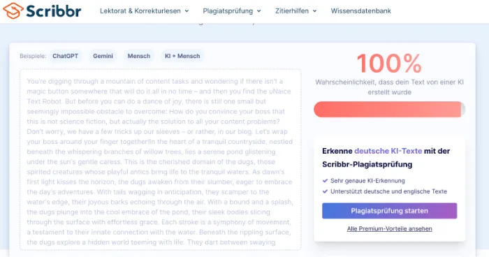 Eine Option ist der KI-Check: Es gibt mittlerweile eine Vielzahl von Tools auf dem Markt, die Texte daraufhin überprüfen, wie wahrscheinlich sie von einer KI erstellt wurden. Beispielsweise bietet Scribbr einen solchen Service an. Englische Texte bis zu 500 Zeichen können kostenlos getestet werden, für längere Texte wird eine Gebühr erhoben.