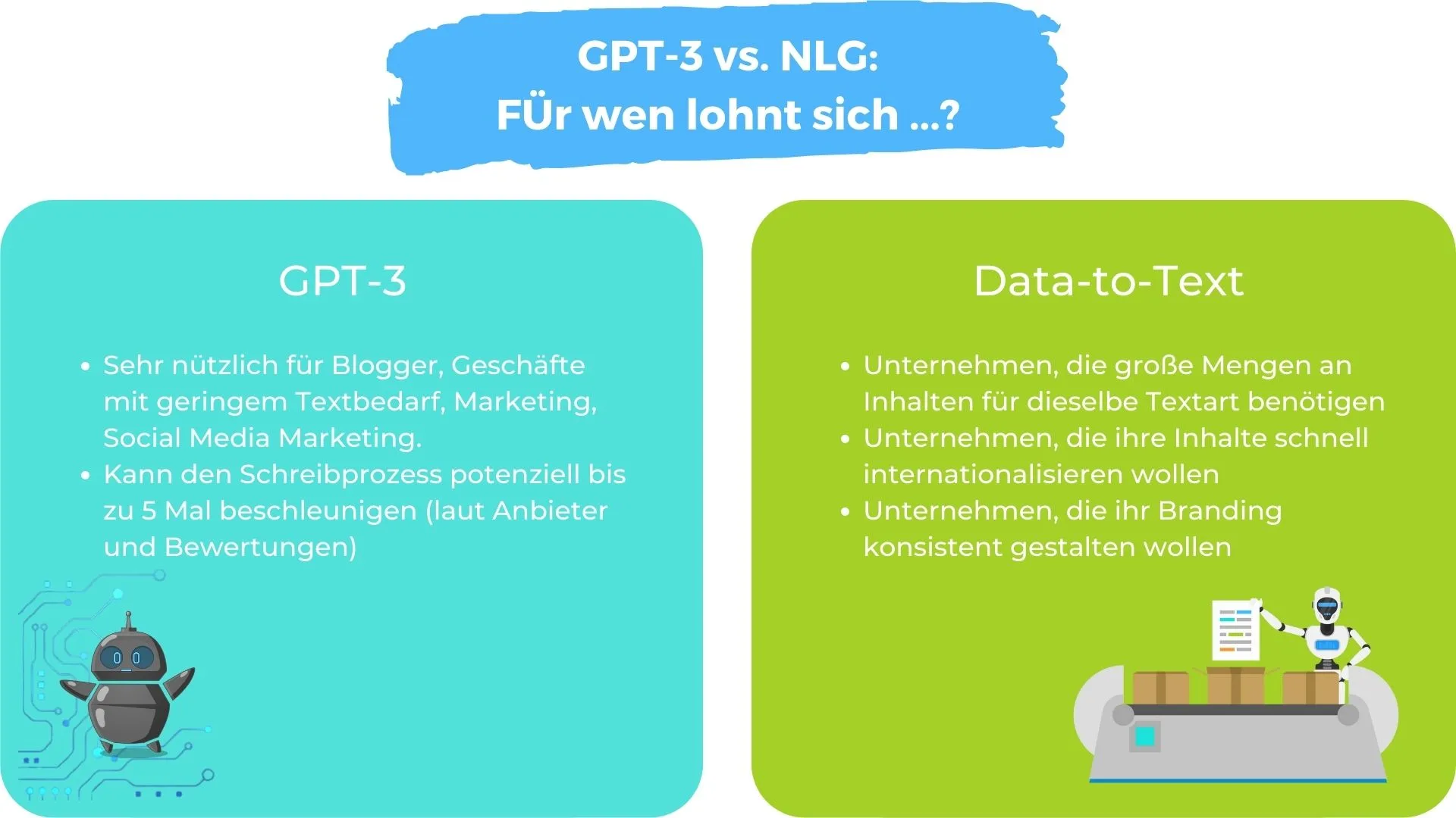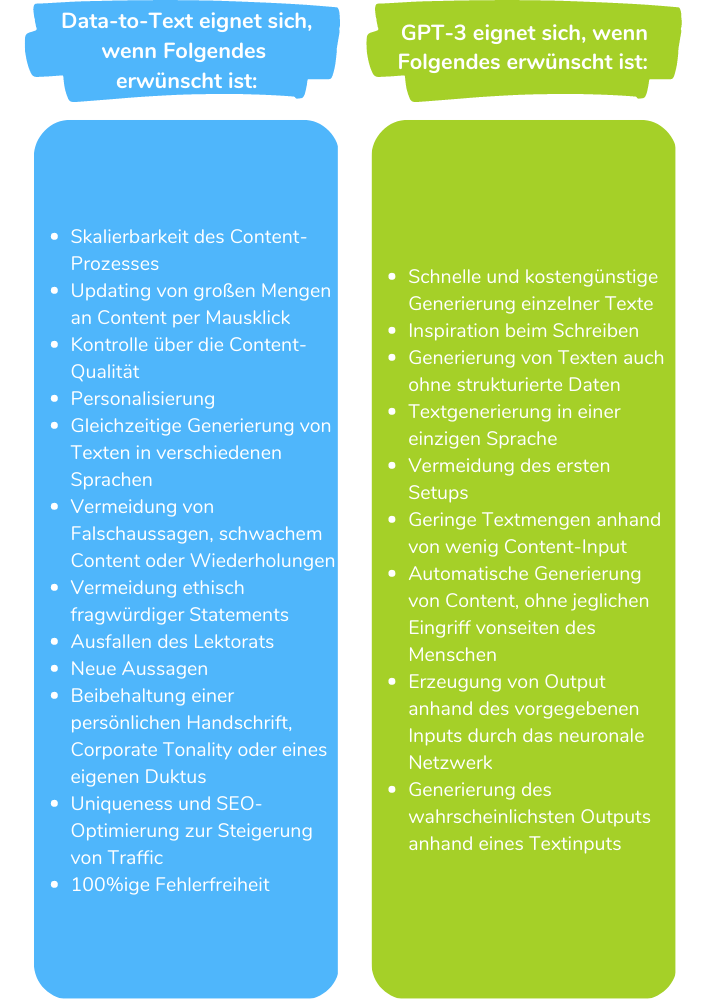 Natürlich haben beide Technologien ihre Stärken und Schwächen. Beide generieren automatisch Texte – eignen sich aber für unterschiedliche Anwendungsfälle.